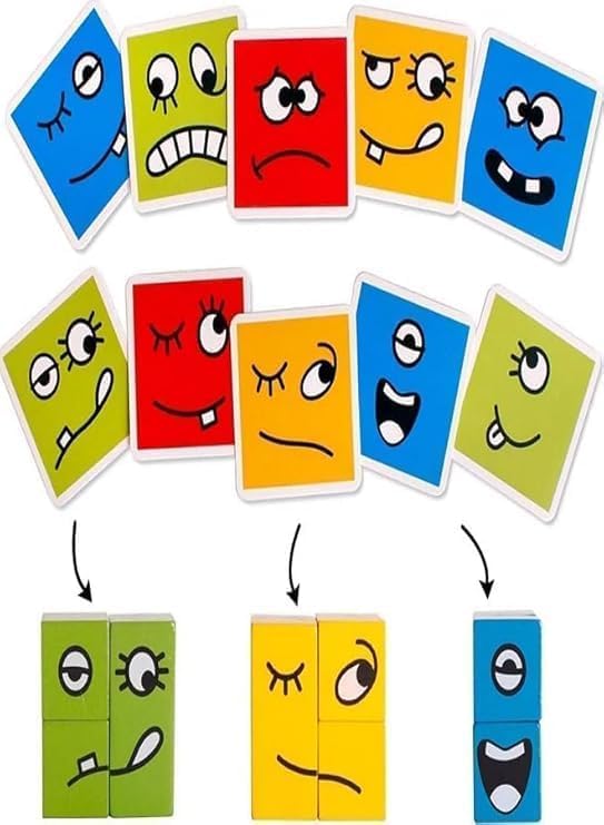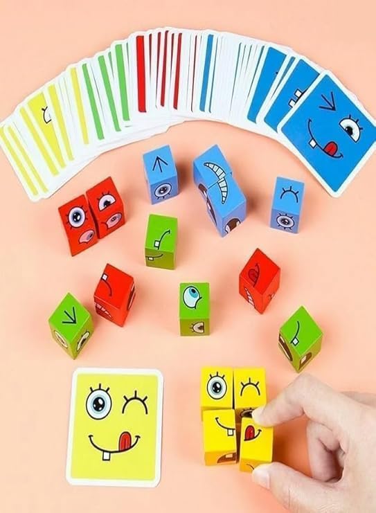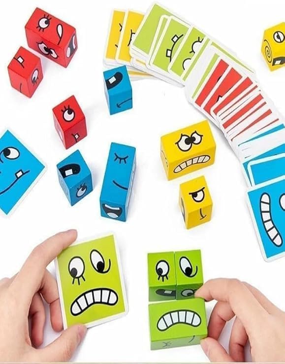 - تصميم تعليمي: تتميز بمكعبات ملونة تحمل تعبيرات وجه متنوعة يمكن مزجها وتبديلها لصنع وجوه مضحكة مختلفة، مما يجعلها مثالية لتعليم الأطفال التعرف على المشاعر.