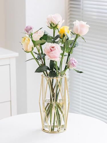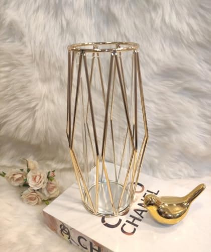 Generic - فازة زجاجية مبتكرة هندسية بإطار معدني، فازة زهور مجففة للمكتب وغرفة النوم وغرفة المعيشة وديكور المكتب - ذهبي 1 | 29 سم