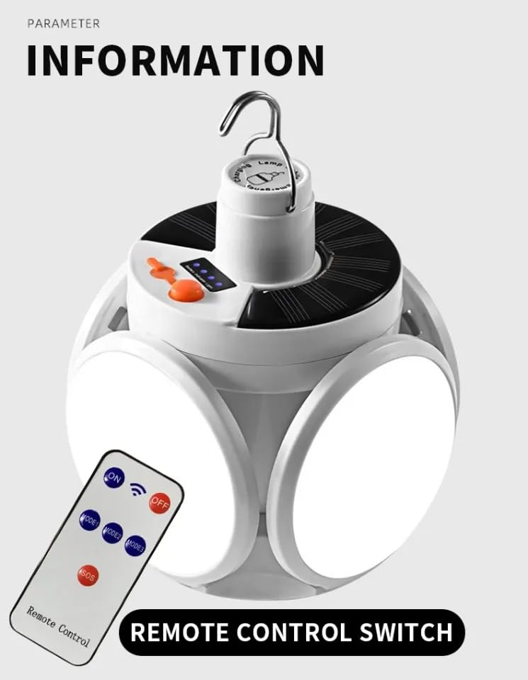 - **مُدعومة بالطاقة الشمسية**: تعمل لمبة التخييم هذه بالطاقة الشمسية، مما يجعلها مثالية للاستخدام في الأماكن بعيدة عن مصادر الكهرباء.