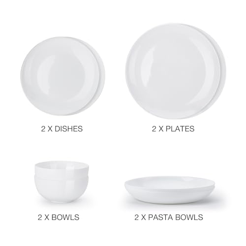 - [طقم عشاء مناسب لشخصين]: يتضمن طبقي عشاء دائريين وطبقين للسلطة و2 بولة سباجيتي و2 بولة للحبوب. جميعها بتصميم حافة الشفاه الحديثة. أطباق مسطحة وأطباق عميقة وبولات بيضاء، أطباق عشاء مقاس 26 سم، أطباق سلطة 19 سم، بولات سباجيتي 20 سم، وبولات 13 سم.