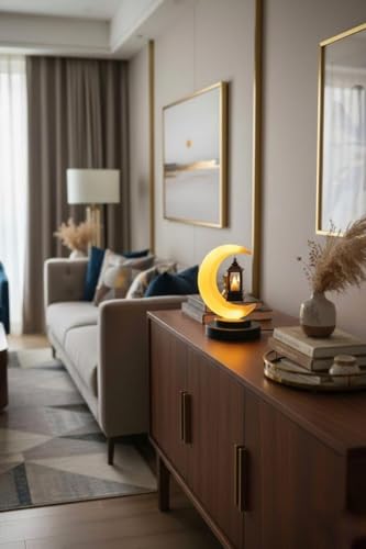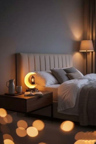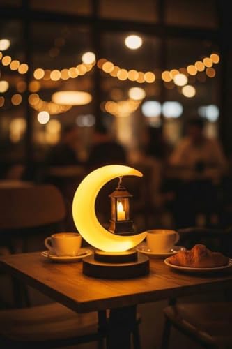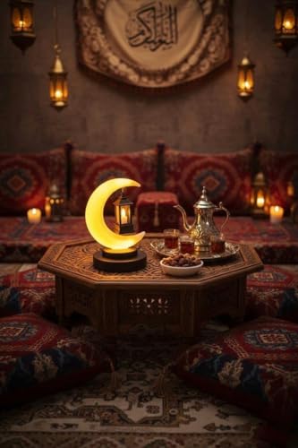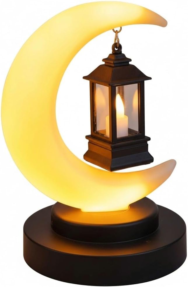 - تصميم إسلامي مميز: مصباح LED على شكل هلال مضيء مع فانوس تقليدي معلق يخلق أجواء رمضانية دافئة ومريحة