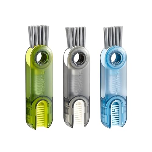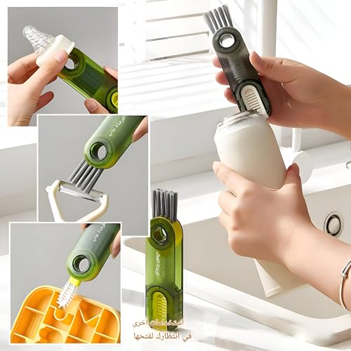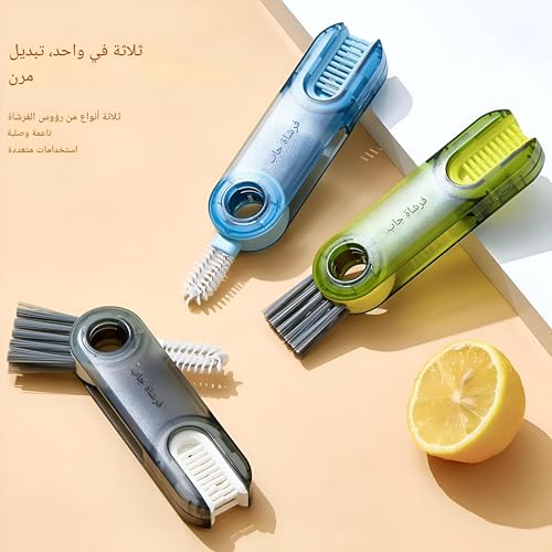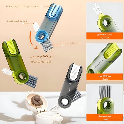 - تحتوي هذه الفرشاة 3 في 1 على ثلاثة رؤوس مختلفة: فرشاة سيليكون على شكل حرف U لتنظيف فم الكوب والبقع العنيدة، فرشاة شق سلكية مجدولة لتنظيف الأخاديد الدقيقة والفراغات بداخل الأغطية، وأخرى لزاوية الحاوية الصعبة لإزالة الأوساخ العميقة، مع قدرة على الدوران 360 درجة في اتجاه واحد لتسهيل الوصول والتنظيف بكفاءة عالية.
