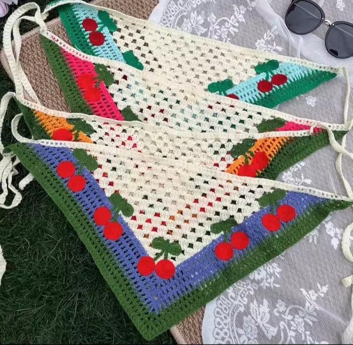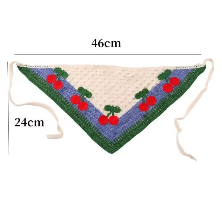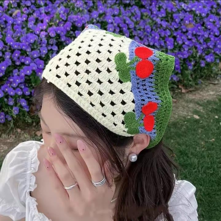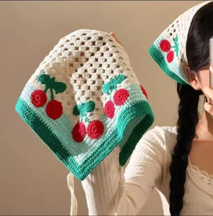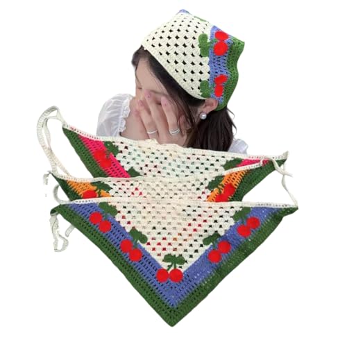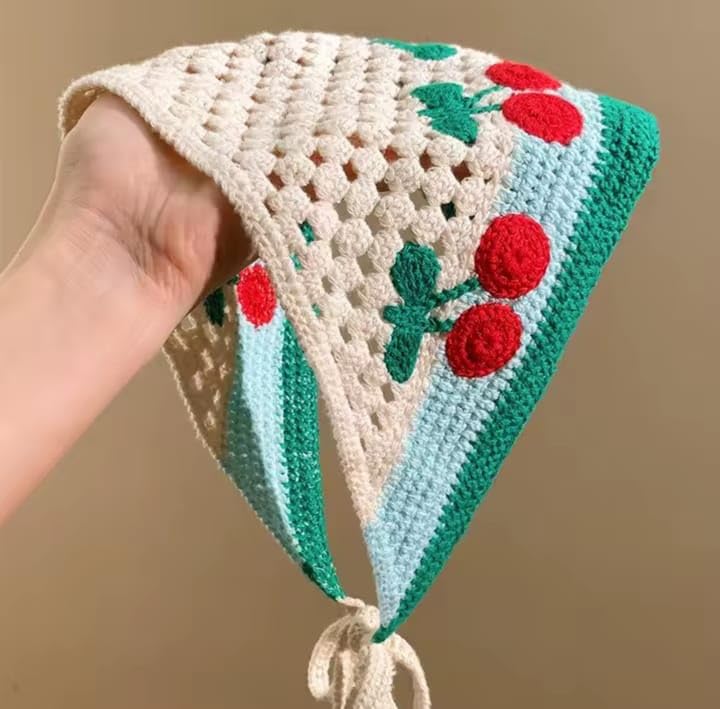 Generic - باندانا كروشيه للشعر، طقم 3 قطع، تصميم مخرم مع نقش الكرز، قطن، متعدد الألوان، 40×24 سم، نمط كلاسيكي ريفي، حواف ملونة، مناسب للنساء والفتيات