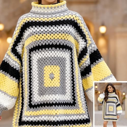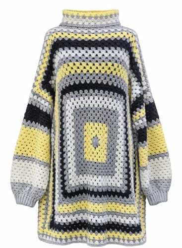 Generic - فستان سترة تريكو كروشيه بياقة عالية، نمط مربعات ملونة، رمادي وأصفر وأسود وأبيض، تصميم فضفاض