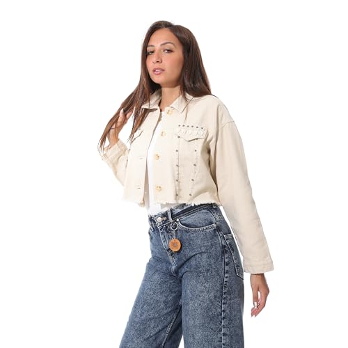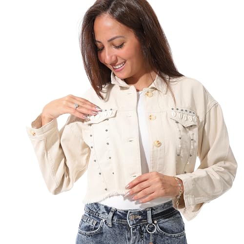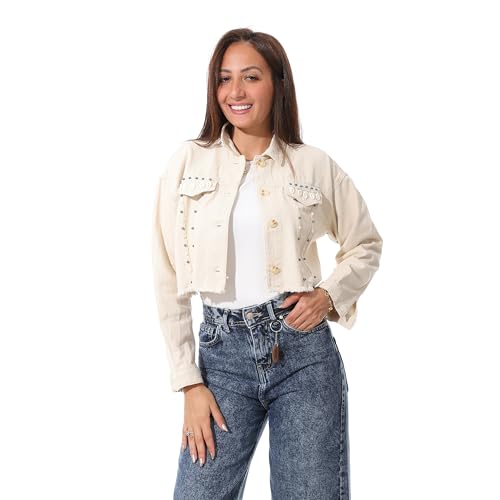 Coctail - جاكيت جبردين قصير بتصميم مرصع، ابيض كريمي، حاشية خام - 17176