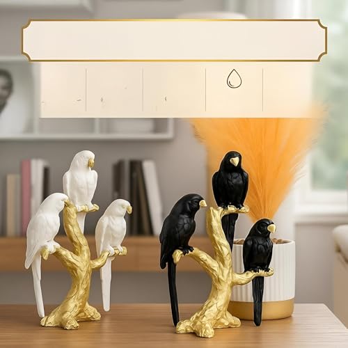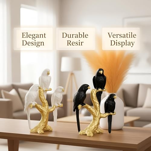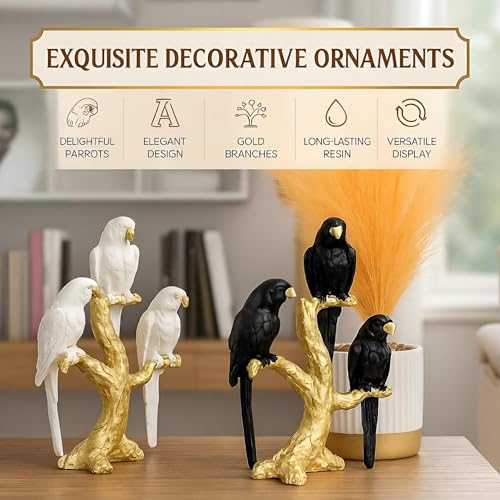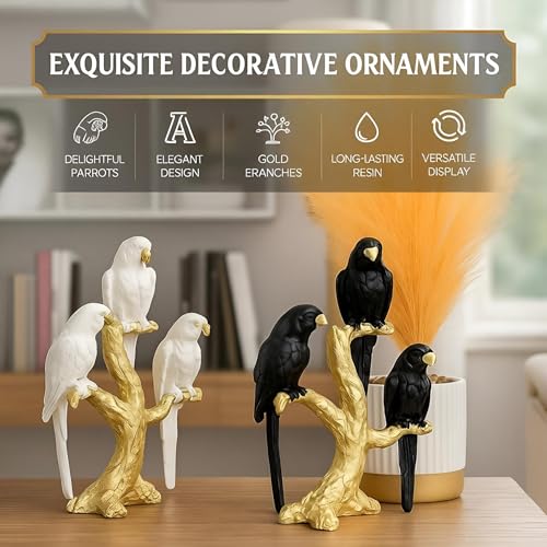 - تماثيل فنية أنيقة على شكل ببغاوات رشيقة مثبتة على فروع ذهبية، مما يضيف إحساسًا بالرقي والسحر الخالد إلى ديكور أي غرفة.