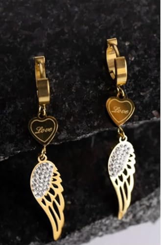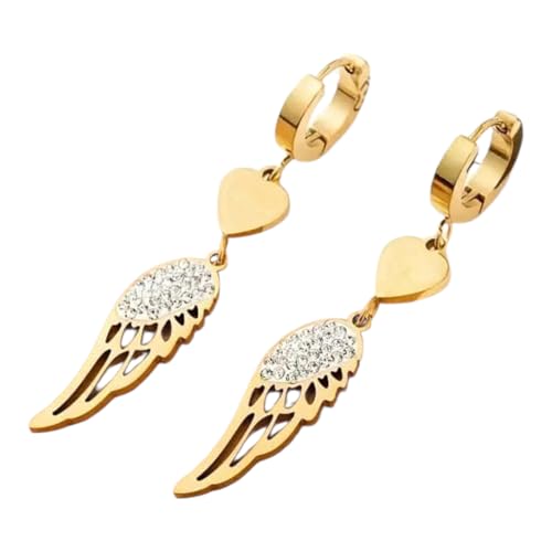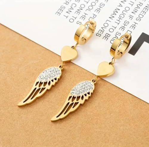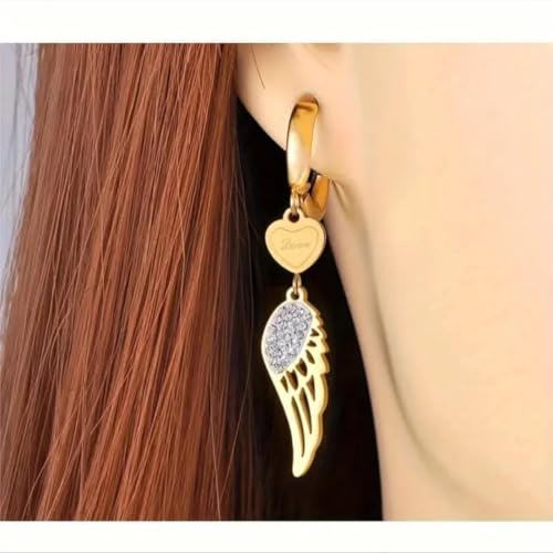 عام - اقراط متدلية على شكل قلب وجناح ملاك كريستالي، نمط حلقي مطلي بالذهب، متدلية من حجر الراين