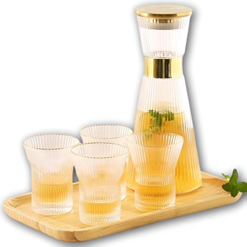 Generic - طقم ابريق بتصميم كريستالي - زجاج مضلع وحواف ذهبية وغطاء من قطعة واحدة و4 اكواب مانعة للتسرب، سعة 1 لتر، تصميم امن للطعام