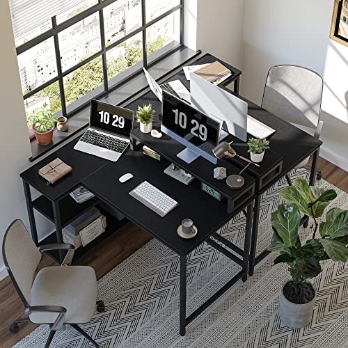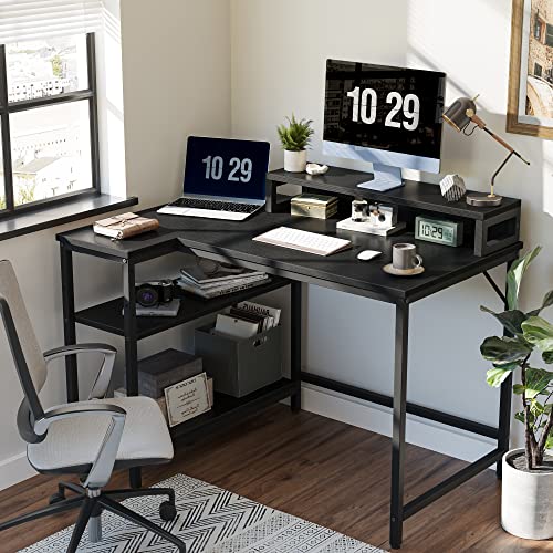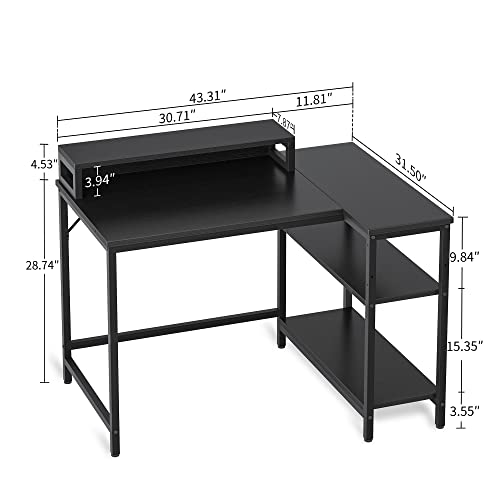 CubiCubi - مكتب كمبيوتر صغير على شكل حرف L من كوبيكوبي، مكتب كمبيوتر مقاس 43 بوصة مع حامل شاشة وارفف تخزين قابلة للعكس، طاولة دراسة للمكتب والمنزل والدراسة، بني