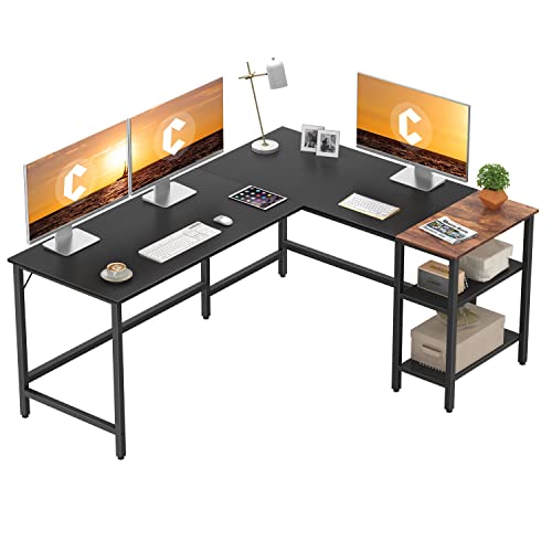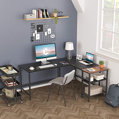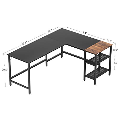 CubiCubi - مكتب كمبيوتر بتصميم ترابيزة كورنر على شكل حرف L موفرة للمساحة مع رفوف تخزين للكتابة والدراسة من كوبي كوبي، اسود/راستيك غامق