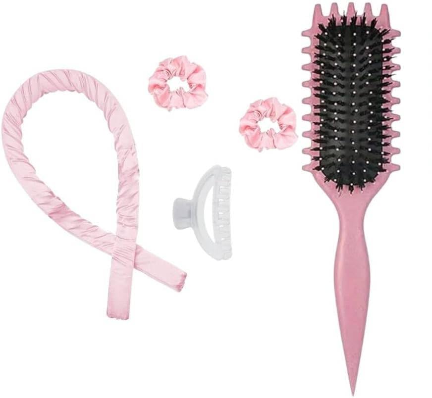 - مجموعة التجعيد الشاملة: فرشاة تحديد تجعيدات الشعر + شريط تمويج من الساتان دون حرارة + 2 توكة شعر من ساتان مطابق + مشبك - كل ما تحتاجين إليه لتصفيف الشعر دون حرارة.