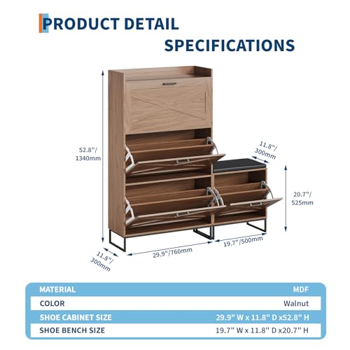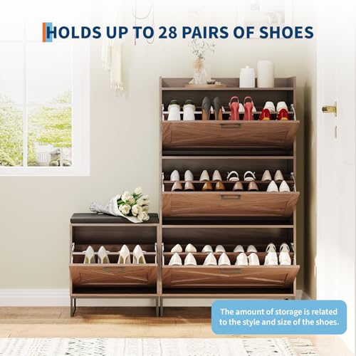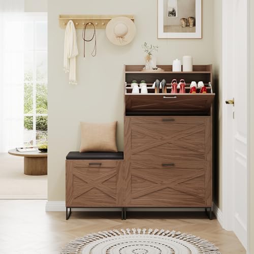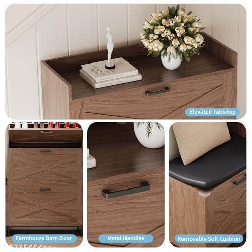 Curtainboro - خزانة احذية من كورتينبورو مع 4 ادراج قلابة، خزانة احذية ضيقة من الخشب بتصميم ريفي مع مقعد تخزين لغرفة المعيشة والرواق والمدخل، لون خشب الجوز