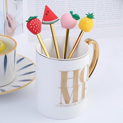 - تصميم لطيف: مجموعة من 6 ملاعق حلوى مطلية بالذهب تتميز بزينة فاكهة رائعة بما في ذلك الفراولة والبطيخ والأفوكادو والخوخ والبرتقال والدوريان