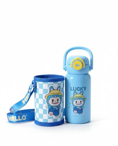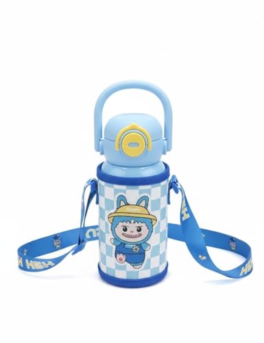 Spaceshoop - زجاجة مياه لطيفة معزولة من الستانلس ستيل للاطفال مع حافظة حمل واقية وحزام كتف قابل للتعديل - قارورة حرارية ساخنة وباردة للمدرسة والسفر - 500 مل (1، ازرق)