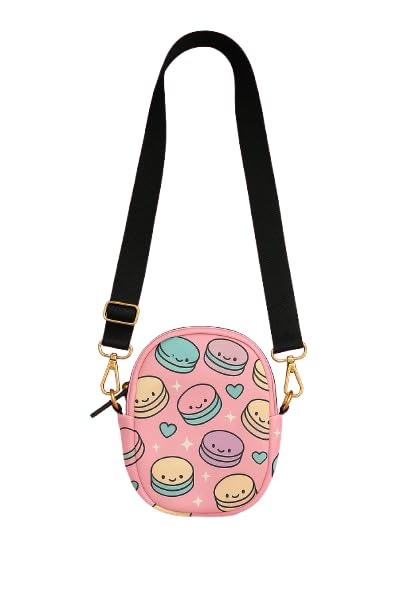 Generic - حقيبة طويلة تمر بالجسم بطبعة ماكارون لطيفة، محفظة صغيرة باللون الوردي مع حزام أسود قابل للتعديل