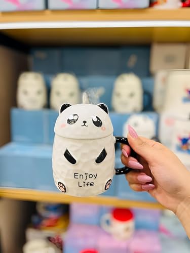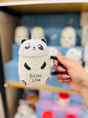 Generic - تخزين بورسلين لطيف على شكل باندا - ابيض مع تفاصيل لطيفة، يتضمن غطاء مع وجه باندا مخفي وكلمات دافئة مثل استمتع بالحياة والحياة الجميلة