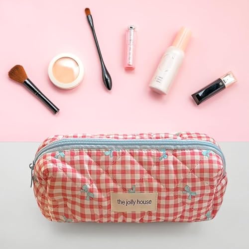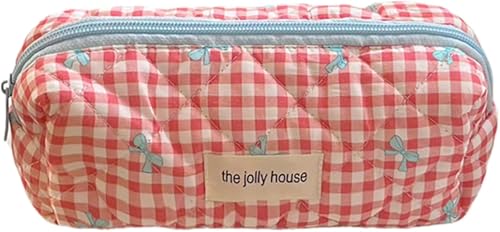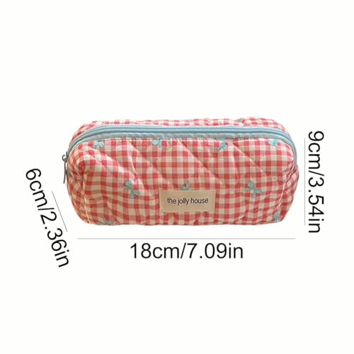 Generic - مقلمة مبطنة لطيفة، شنطة مكياج بنمط قماش قطني احمر مع فيونكة زرقاء، 18 سم × 9 سم