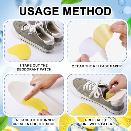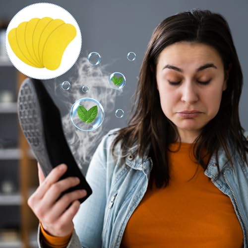 - انتعاش يدوم طويلاً: تستخدم ملصقات مزيل العرق للقدم هذه مكونات نشطة طبيعية ولها رائحة الليمون؛ يمكن لملصقات النعل الداخلي لمزيل العرق هذه أن تحييد الروائح بسرعة في الأحذية وتحافظ عليها منتعشة ومريحة لفترة طويلة