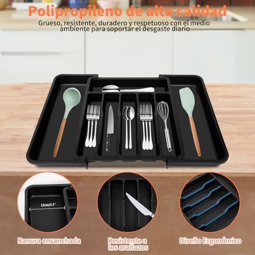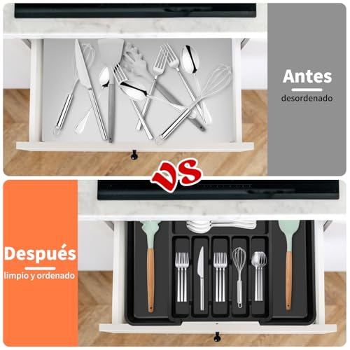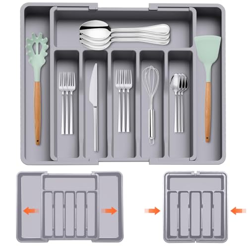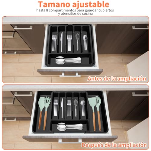 MIGUHOGAR - منظم ادوات المائدة، مقسم ادراج ادوات مائدة قابل للتوسيع، منظم درج المطبخ مع 8 اقسام لتخزين الملاعق والشوك والسكاكين واطباق ادوات المائدة (رمادي)