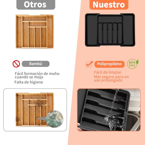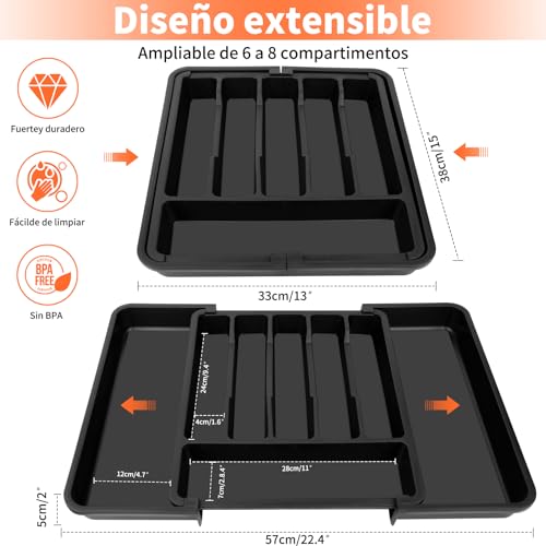 - 8 مساحات تخزين كبيرة السعة: يمكن فتح منظم أدوات المائدة إلى 8 أقسام، وهو مثالي لتصنيف أدوات المائدة وأدوات المطبخ وتوفير مساحة أكبر. يوجد لوحان قابلان للتمدد على الجانبين الأيسر والأيمن، والحجرة الطويلة مثالية لتخزين السكاكين الكبيرة وأدوات المائدة، والحجرة المتوسطة مثالية لتخزين الملاعق والشوك والسراويل الداخلية.