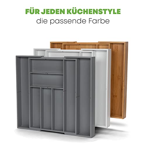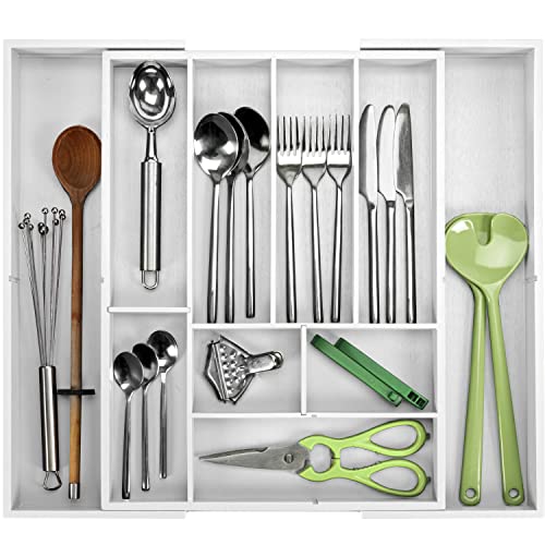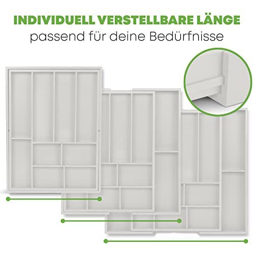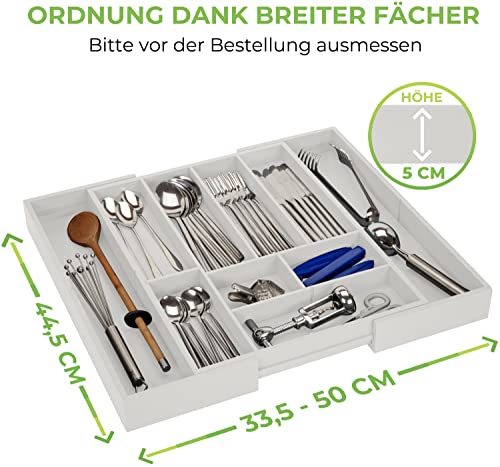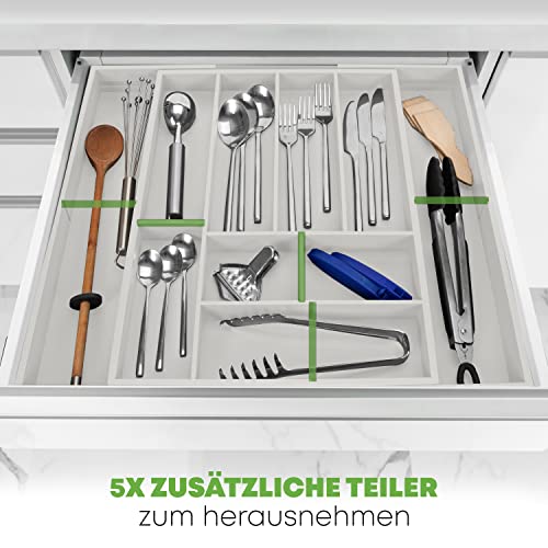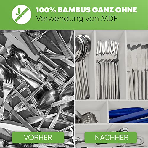 Kamoro HOME & KITCHEN - صينية ادوات مائدة للادراج مصنوعة من الخيزران عالي الجودة - حشوة ادوات تناول الطعام مع 5 فواصل قابلة للازالة [6 الى 13 قسم] - درج مع نتوءات مانعة للانزلاق وطول من 34 الى 50 سم (ابيض)