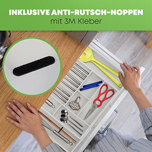 - ✔️ مرن: يتكيف المنظم المتغير بسهولة مع أي درج مطبخ بفضل الطول القابل للتعديل من 33.5 إلى 50 سم. يبلغ عمق الحشوة 44.5 سم وارتفاعها 5 سم وبالتالي فهي مناسبة لجميع الأدراج القياسية.