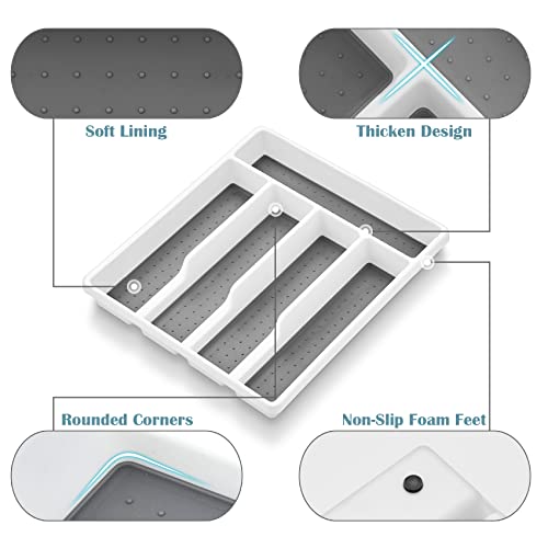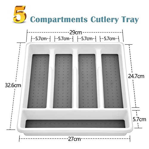 - 5 صواني أدوات مائدة منفصلة: المقاس 29 × 32.6 × 4.5 سم مناسب لمعظم أدراج المطبخ (يرجى قياس حجم درجك قبل الشراء)، تأتي مع 5 مساحات تخزين، مما يضمن مساحة كافية للسكاكين والشوك والملاعق والأواني، تصميم أنيق باللونين الأبيض والرمادي يناسب أي ديكور مطبخ