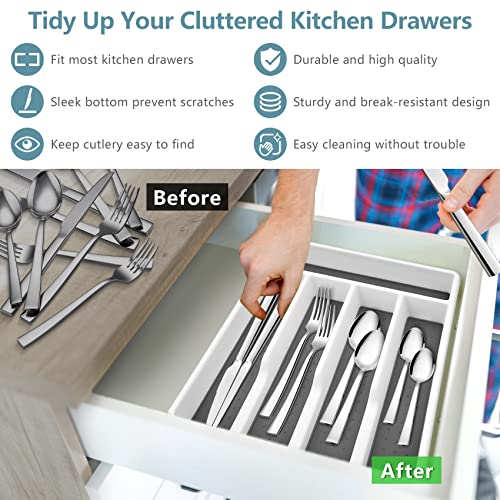 - مقاومة للانزلاق ومتينة: كل فاصل زمني مجهز ببطانة ناعمة الملمس لإعطاء وسادة جيدة، تأكد من أن أدوات المائدة الخاصة بك لن تتحرك وتحميها من التلف، أقدام مطاطية صغيرة في الأسفل للحفاظ على الثبات ومنع الانزلاق في الدرج