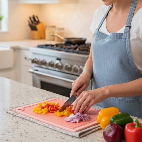 - لا مزيد من الانزلاقات: يحافظ السطح غير القابل للانزلاق على ثبات لوح التقطيع، لذلك ينزلق السكين بأمان أثناء تحضير خضروات الكوشري أو السلطة للإفطار - بدون تمايل أو إجهاد.