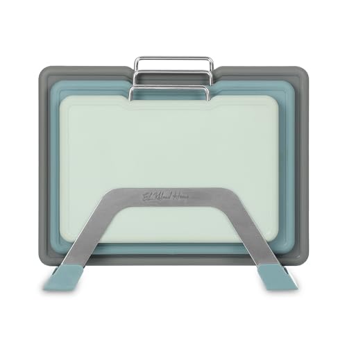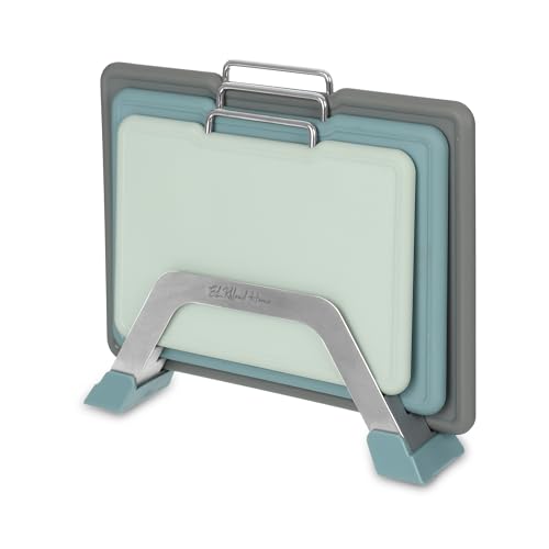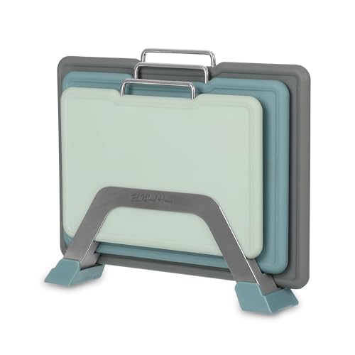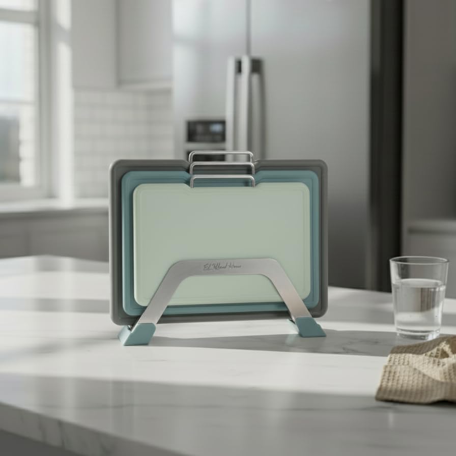 - مجموعة كاملة: تتضمن 3 ألواح تقطيع متينة بألوان متدرجة (رمادي، أزرق مخضر، نعناعي) مع مقابض حمل مريحة من الستانلس ستيل وحامل أنيق مطابق.