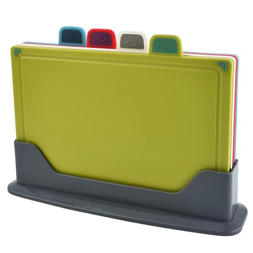 Generic - لوح تقطيع - مجموعة من 4 الواح بلاستيكية متينة مع حواف تجديف، تصميم لحفظ العصير، اسطح مزدوجة الاستخدام، وحامل تخزين مدمج لتنظيم المطبخ الحديث