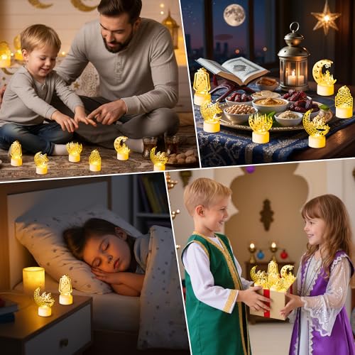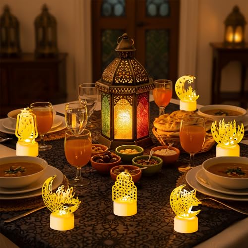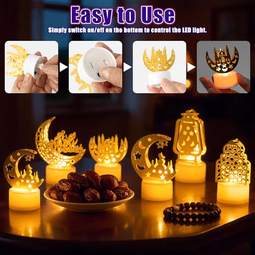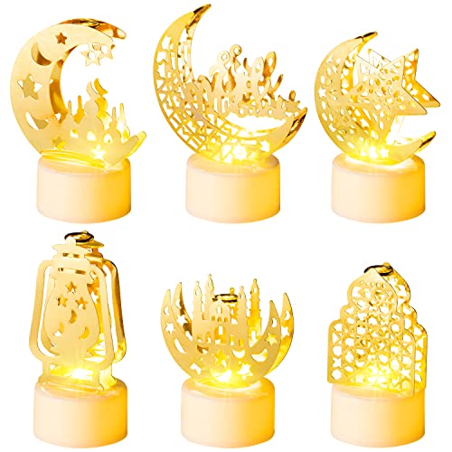 CUweipeng - 6 قطع مصابيح زينة فانوس رمضان من كوبينج، تصميم منارة قمر وقلعة وعبارة Eid Mubarak، بطارية متضمنة، مصباح ليد بلاستيك لحفلات العيد ورمضان للمنزل والأماكن المغلقة والمفتوحة وديكور لسطح الطاولة