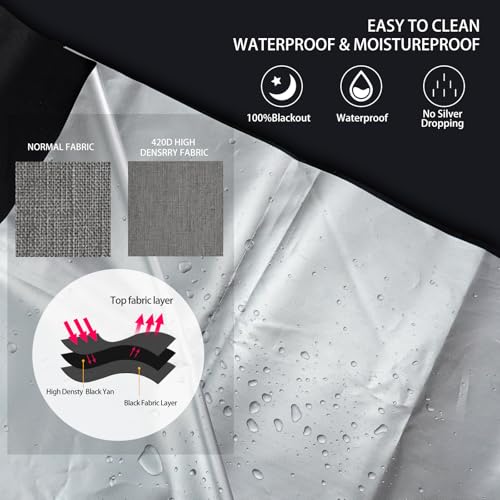 - 【ستائر تعتيم】ستائر التعتيم المحمولة مصنوعة من قماش اوكسفورد عالي الكثافة 420D، مع طلاء من البولي يوريثان الفضي من الخارج، والذي يتميز بقدرة ممتازة على حجب الضوء وعكس الأشعة فوق البنفسجية والحرارة. تخلق بيئة نوم مريحة ومريحة لك.