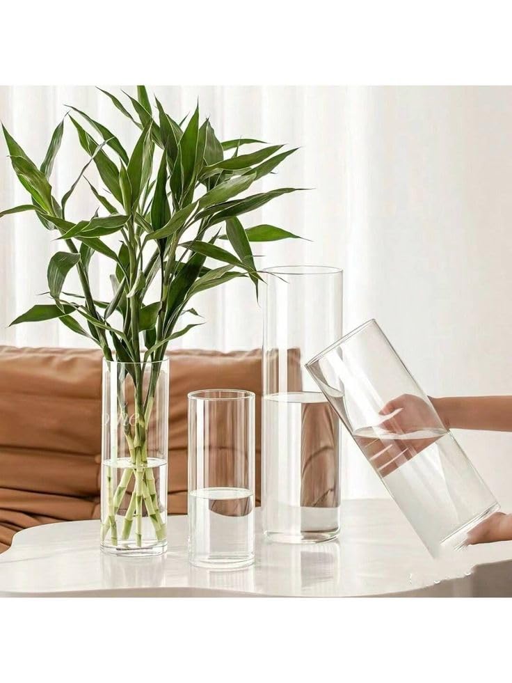 - ١) مجموعة متكاملة: طقم من ٥ مزهريات زجاجية أسطوانية بأحجام متدرجة، مثالية للديكور المنزلي العصري