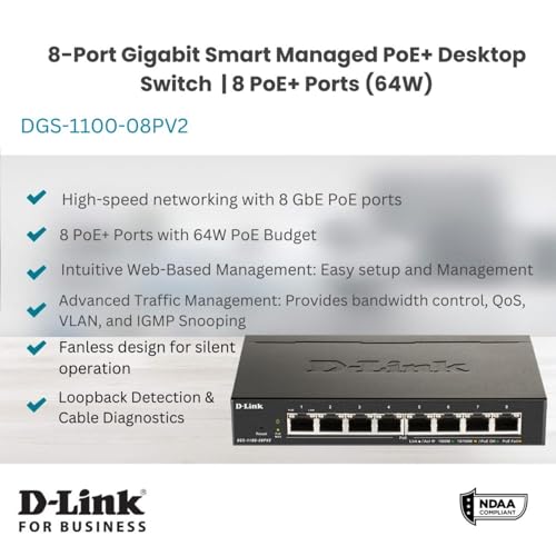 D-Link - محول جيجابت ذكي 8 منافذ جيجابت، 8 منافذ PoE+ (64 وات)، (L2)، دعم الشبكات الافتراضية المحلية (VLANs)، تشخيص الكابلات، إدارة الويب، تصميم مكتبي وبدون مروحة، متوافق مع NDAA من دي-لينك، (DGS-1100-08PV2)