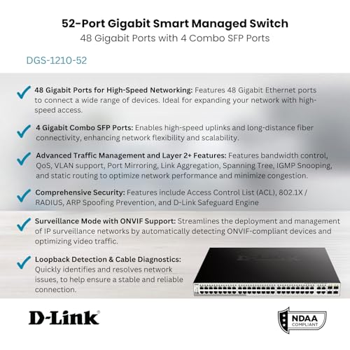 D-Link - دي-لينك محول ايثرنت 48 52 منفذ ذكي مدارة بطبقة 2+ جيجابت مع 4 منافذ جيجابت ار جيه 45/SFP كومبو (DGS-1210-52)