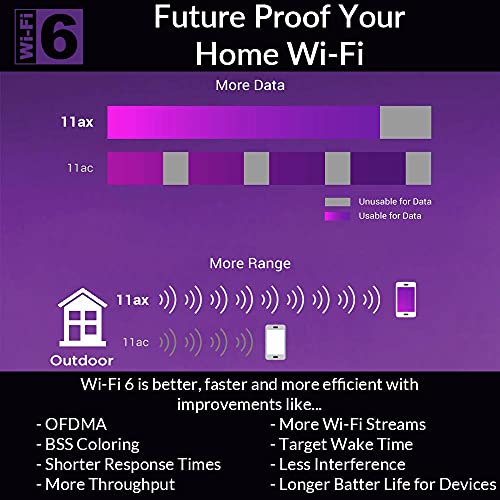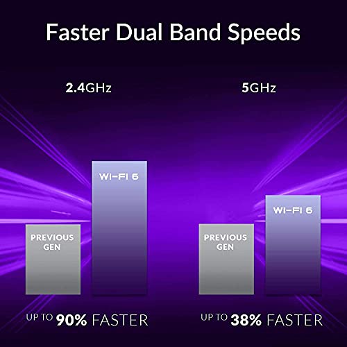 - سرعات AX1800 تصل إلى 574 ميجابت في الثانية (2.4 جيجاهرتز) + 1200 ميجابت في الثانية (5 جيجاهرتز) أسرع بنسبة تصل إلى 90% على 2.4 جيجاهرتز وأسرع بنسبة تصل إلى 38% على نطاقات 5 جيجاهرتز وفقًا لمعايير واي فاي الحالية