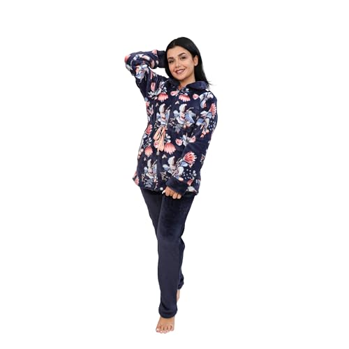 Dadoush - طقم بيجاما نسائي من قطعتين من الفرو، بنطلون وسترة بسحاب، بنقشة زهور - يجامة فرو حريمي كم طويل من دعدو
