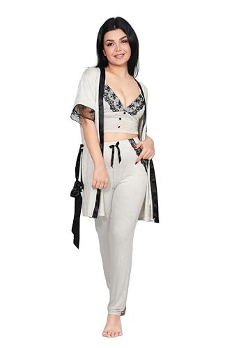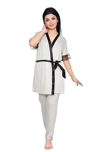 Shower - بيجامة حريمي 3 قطع من دعدوش - طقم بيجامة حريمي صيفي مع روب قصير مزينة بشريط دانتيل (سكري مونس, 3XL)
