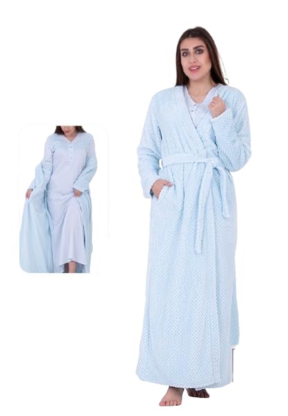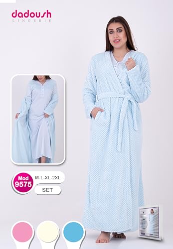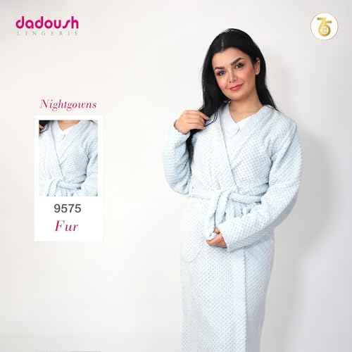 Dadoush - كمينو حمام نسائي طويل مبطن، أزرق فاتح، مع أكمام طويلة وجيوب، قميص نوم فرو نسائي - ثوب حريمي شتوي من دعدوش - روب حريمي فرو طويل
