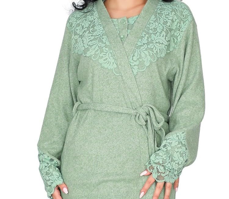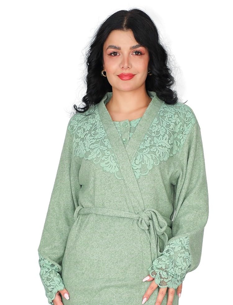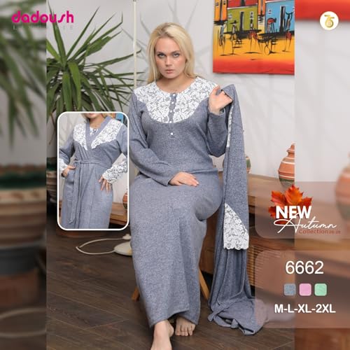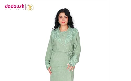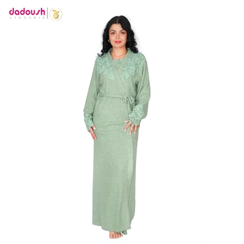 Dadoush - طقم روب وقميص نوم نسائي فاخر من القطن، مزين بالدانتيل - طقم كيمونو من القطن الفاخر - عباية نوم طويلة للنساء مع تطريز للحفاظ على دفئك من دعدوش
