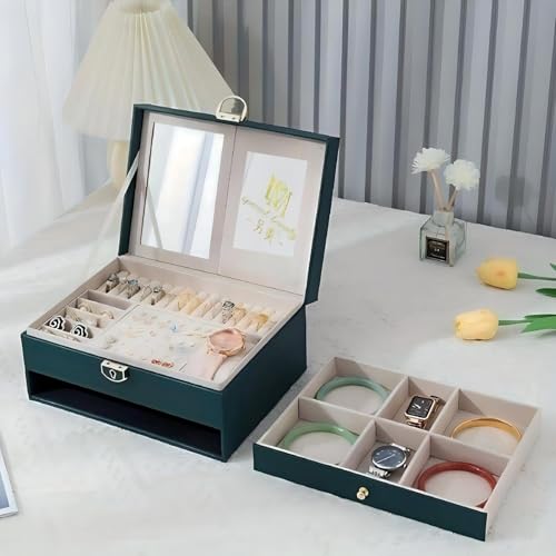 Generic - صندوق تنظيم المجوهرات اليومي - منظم إكسسوارات عملي للاستخدام اليومي في المنزل والمكتب - جيوب متعددة للخواتم والسلاسل والأقراط مع درج خاص للساعة