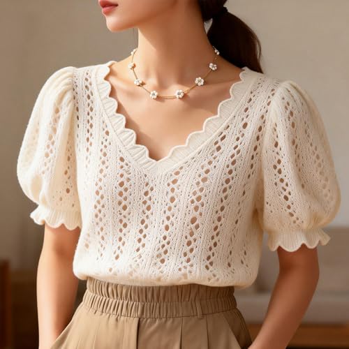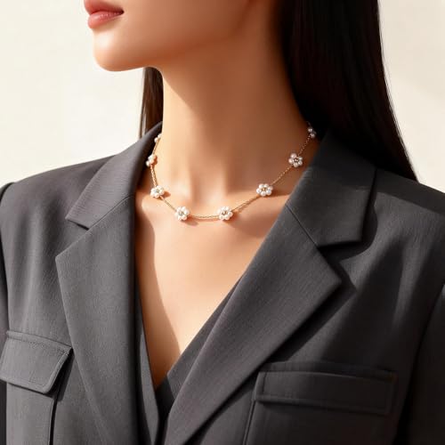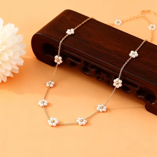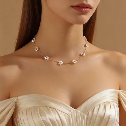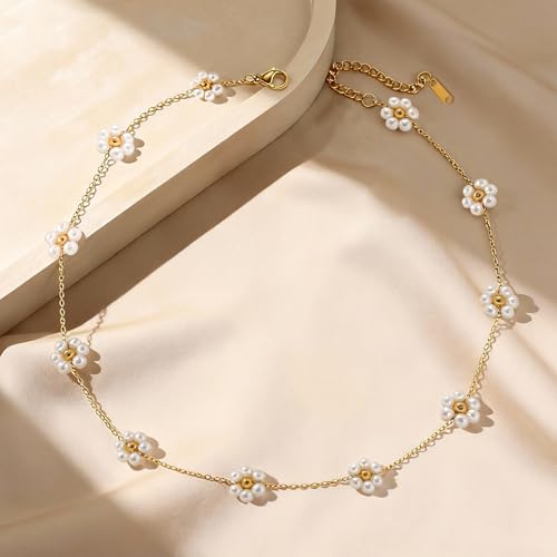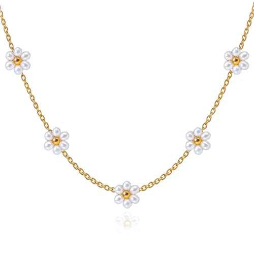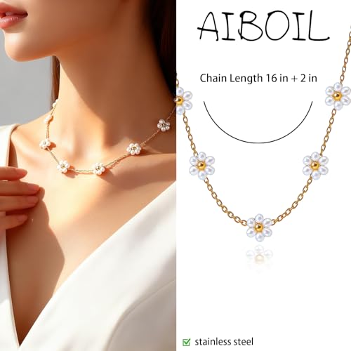 AIBOIL - قلادة ديزي للنساء | هدايا عيد الحب والذكرى السنوية واعياد الميلاد والتخرج | لؤلؤ مع خرز ذهبي | مجوهرات قلادة على شكل زهرة يدوية | ستانلس ستيل