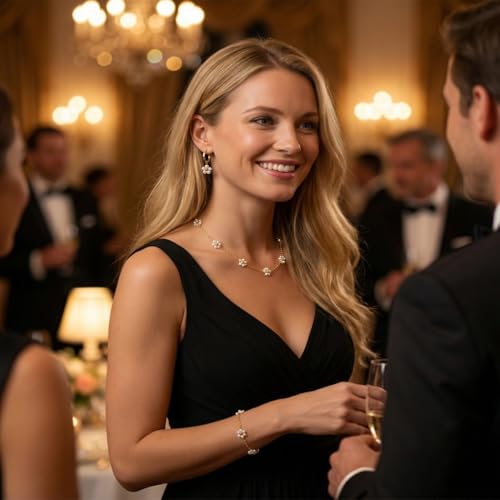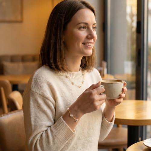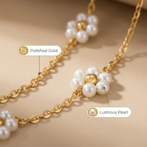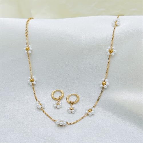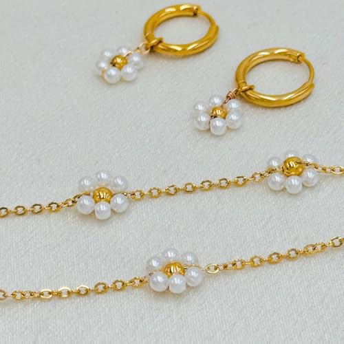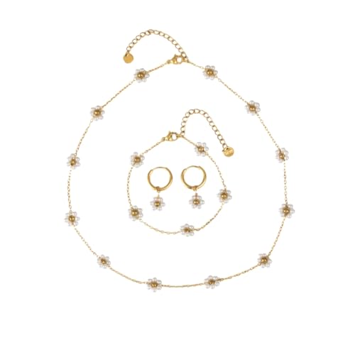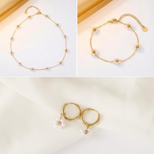 CHICVISION - طقم سلسلة وسوار وحلق من اللؤلؤ بتصميم زهرة الأقحوان مكون من 3 قطع، مجوهرات شوكر أنيقة للنساء كهدية من فولاذ مقاوم للصدأ المطلي بالذهب عيار 14 قيراط، هدية عيد ميلاد للنساء