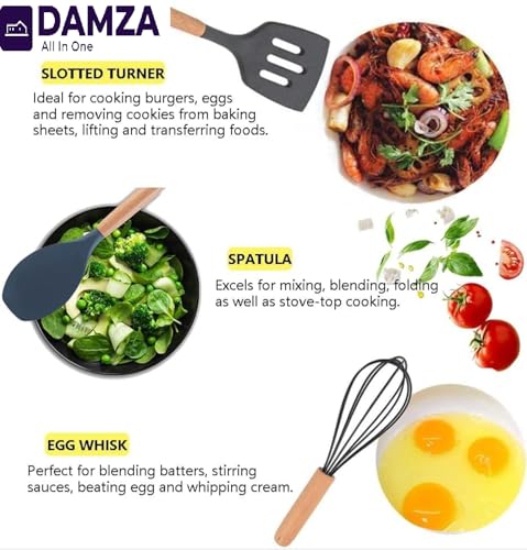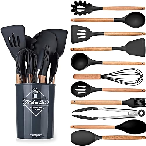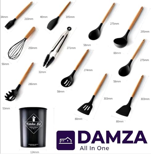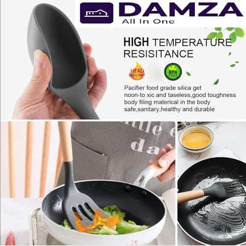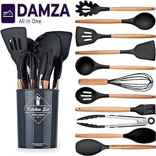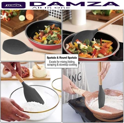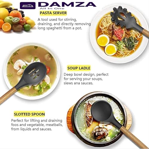 DAMZA - مجموعة أواني الطهي من السيليكون من دامزا - مقاومة للحرارة، ملقط تقليب وملعقة وملعقة وفرشاة وخفاقة ومقبض خشبي، أواني طهي رمادية مع حامل لأواني الطهي غير اللاصقة (أسود)