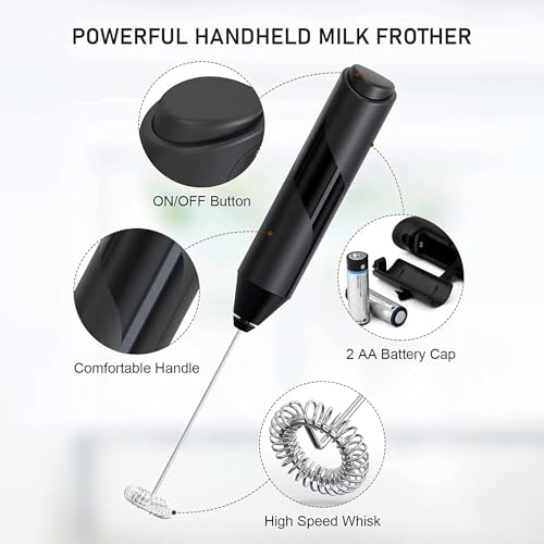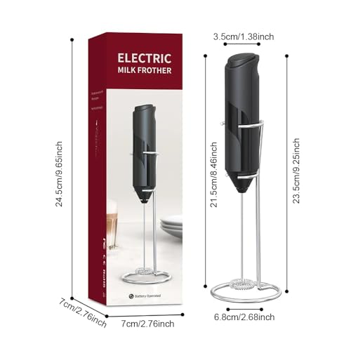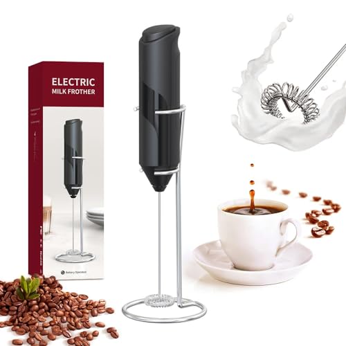 Danett - ماكينة صنع رغوة الحليب الكهربائية المحمولة باليد من دانيت مع حامل من الستانلس ستيل، خفاقة تعمل بالبطارية وصانعة رغوة للقهوة واللاتيه والكابتشينو والشوكولاتة الساخنة وخلاط المشروبات (اسود)