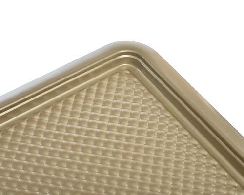 - صينية فرن أنيقة من الصلب الكربوني بلمسة نهائية ذهبية لتوزيع الحرارة بشكل متساوي وضمان المتانة.