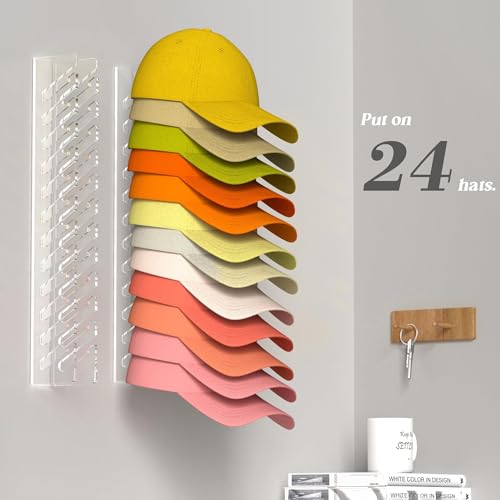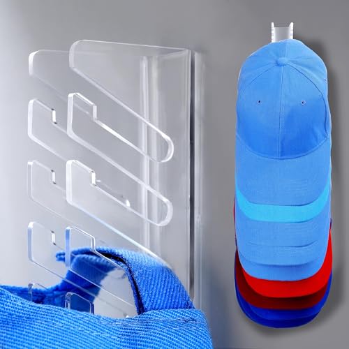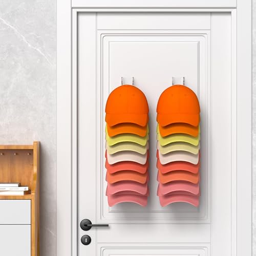 Daoun - حامل ومنظم قبعة شفاف من الأكريليك يثبت على الحائط بدون ثقب ومزود بلاصق قوي وخطاف لتنظيم باب الخزانة وغرفة النوم، طقم من قطعتين
