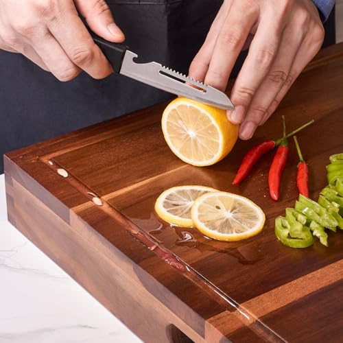 - جودة خشب الأكاسيا الفاخرة: غطاء الموقد مصنوع من خشب الأكاسيا المتين، وهو مصمم لملامسة الطعام ويتميز بأخدود عصير عميق لالتقاط السوائل الزائدة. يسمح هيكله القوي بالقطع المباشر، مما يضمن قدرته على التعامل مع جميع احتياجات إعداد وجباتك