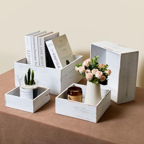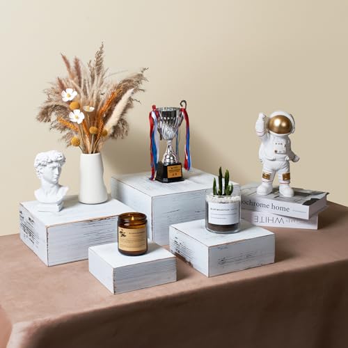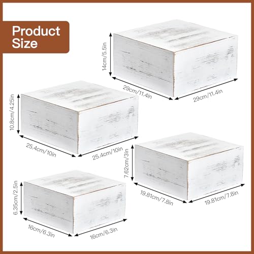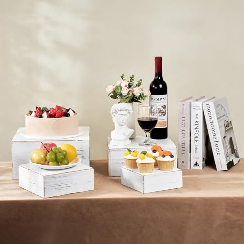 DAOYOUSKY - مجموعة من 4 حوامل خشبية ريفية للكعك والكب كيك من داويوسكي، حامل عرض خشبي مربع لحفلات الزفاف، طاولة بوفيه مكعبة للحلوى والطعام والبسكويت وعروض الحرف اليدوية، ابيض